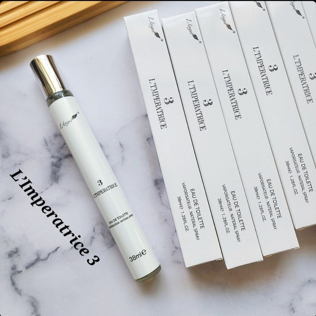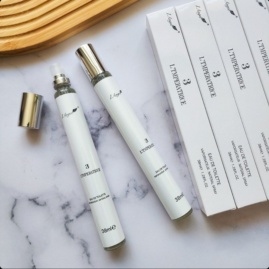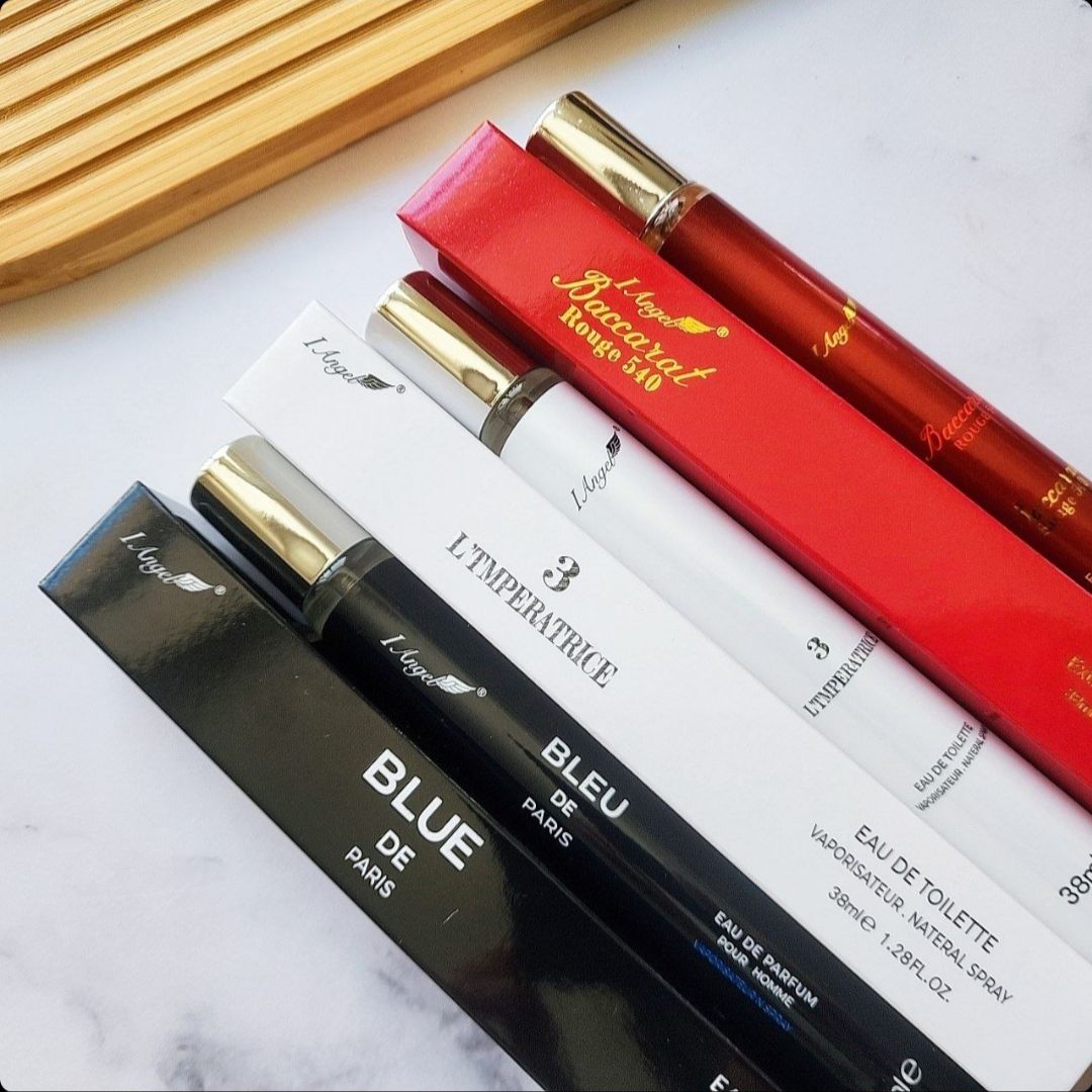 عطر قلمی از برند L’Angel مشاهده میشود. این عطرها نسخههای الهامگرفته از رایحههای مشهور جهانی هستند و هر کدام حدود ۳۸ میلیلیتر حجم دارند.
